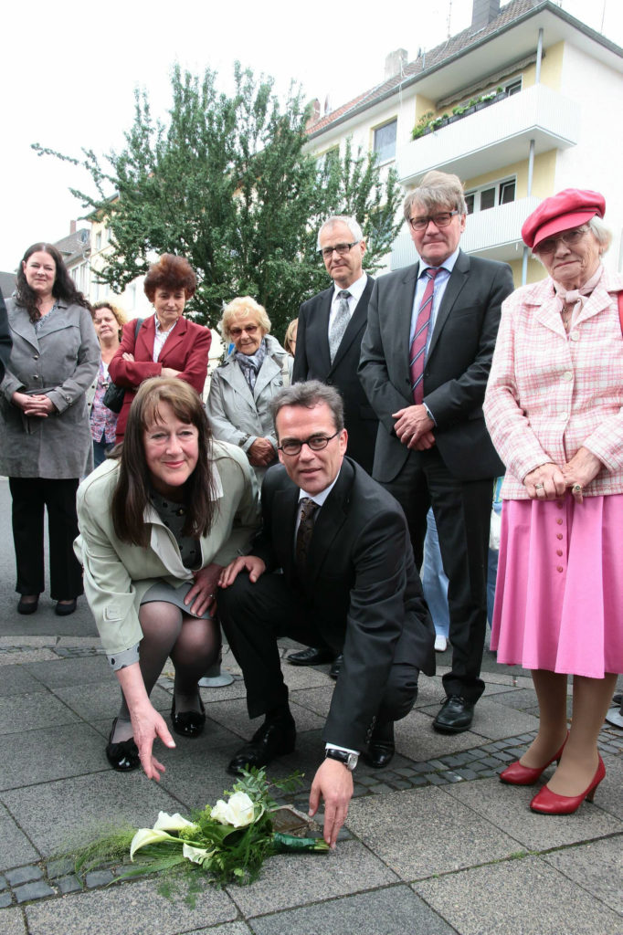 Ihr Weg führte sie auch zu dem für Margarete Papendell verlegten Stolperstein, wo eine Nichte zusammen mit dem OB Blumen niederlegte.
