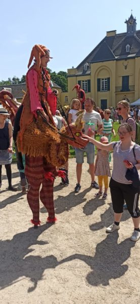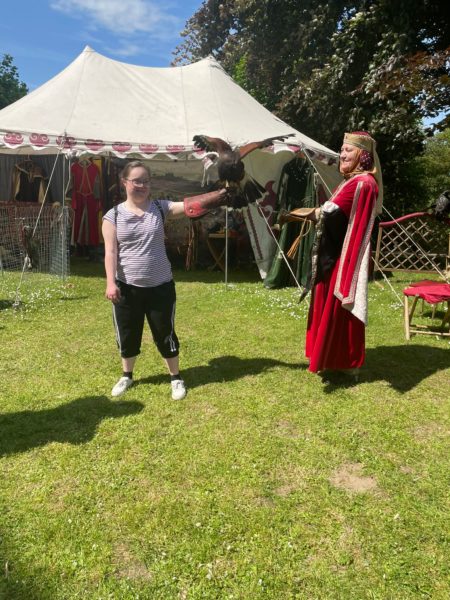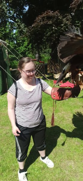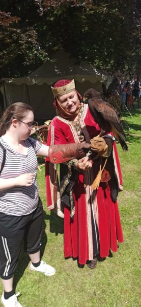 Klienten vom AUW haben den traditionellen Flachsmarkt in Linn besucht. Eine junge Frau, Lena Herrmann, war besonders mutig und hat sich der Falknerin und ihrem Greifvogel genähert.